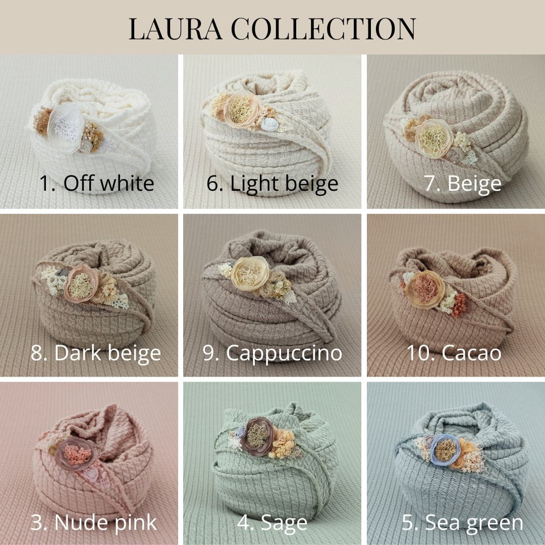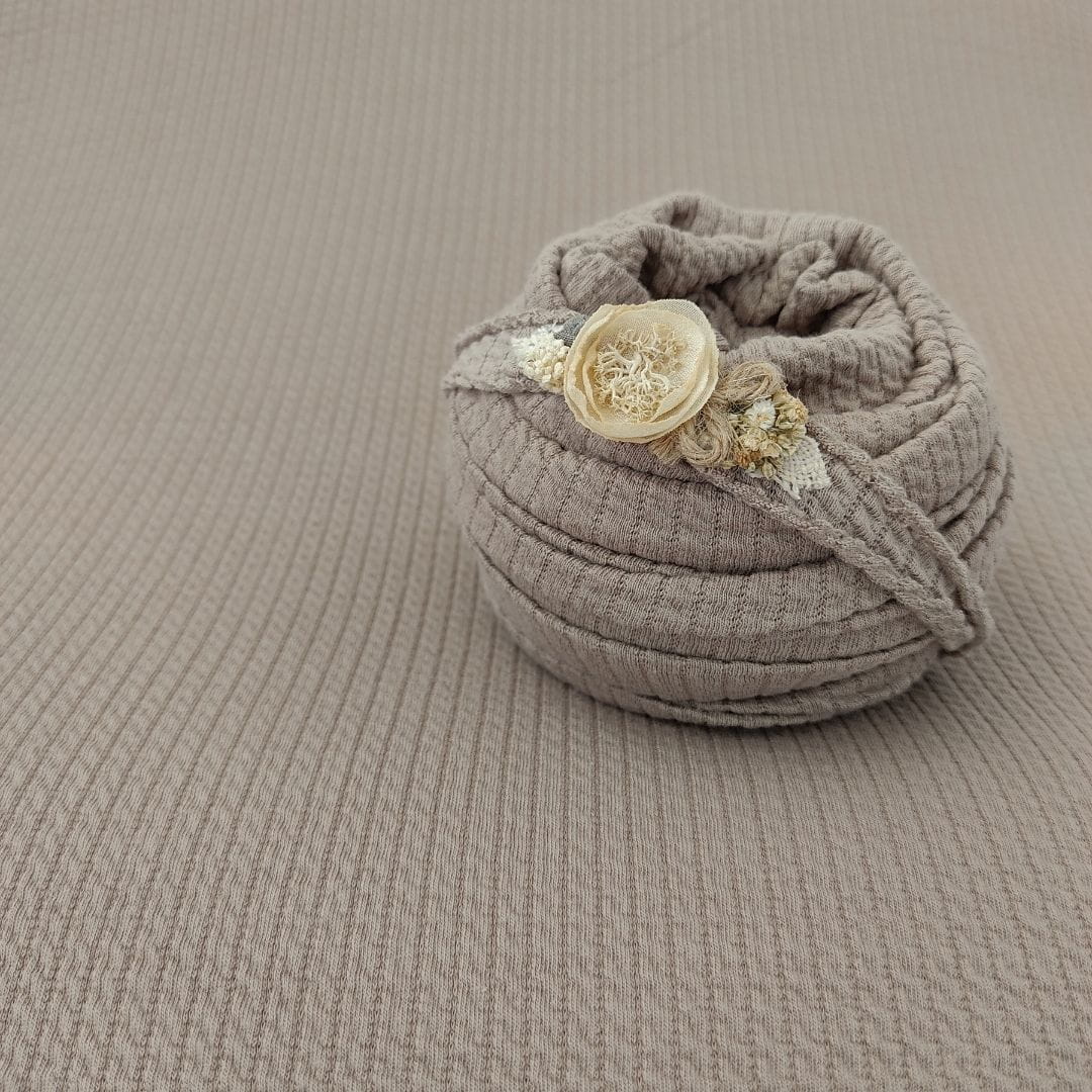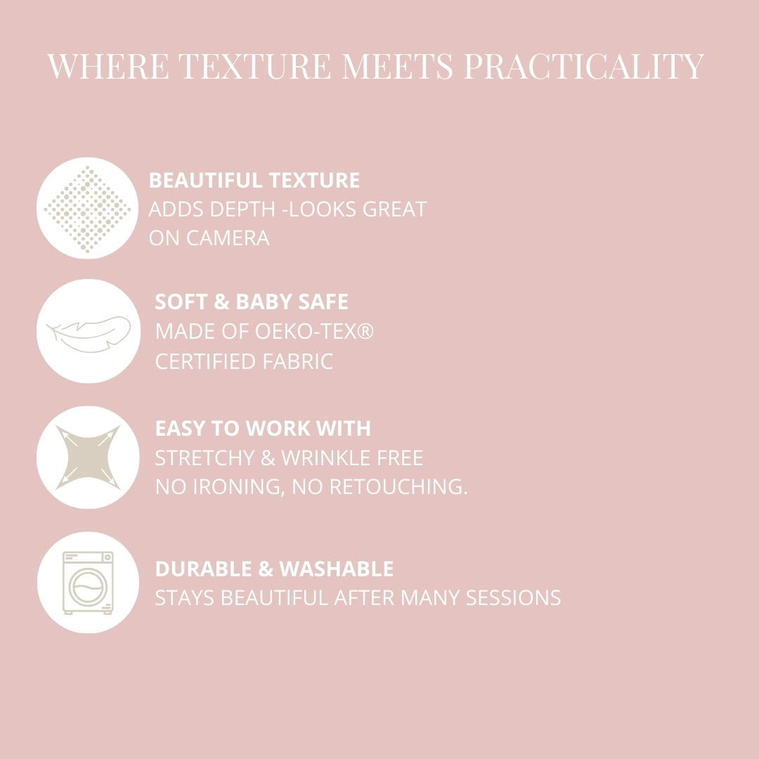 Laura Cappuccino is a soft taupe — a balanced mix of beige and grey — that works beautifully as a base for many newborn setups. It’s the textured version of our smooth Pola Cappuccino, so you can easily mix the two for added depth or keep them separate for different looks.