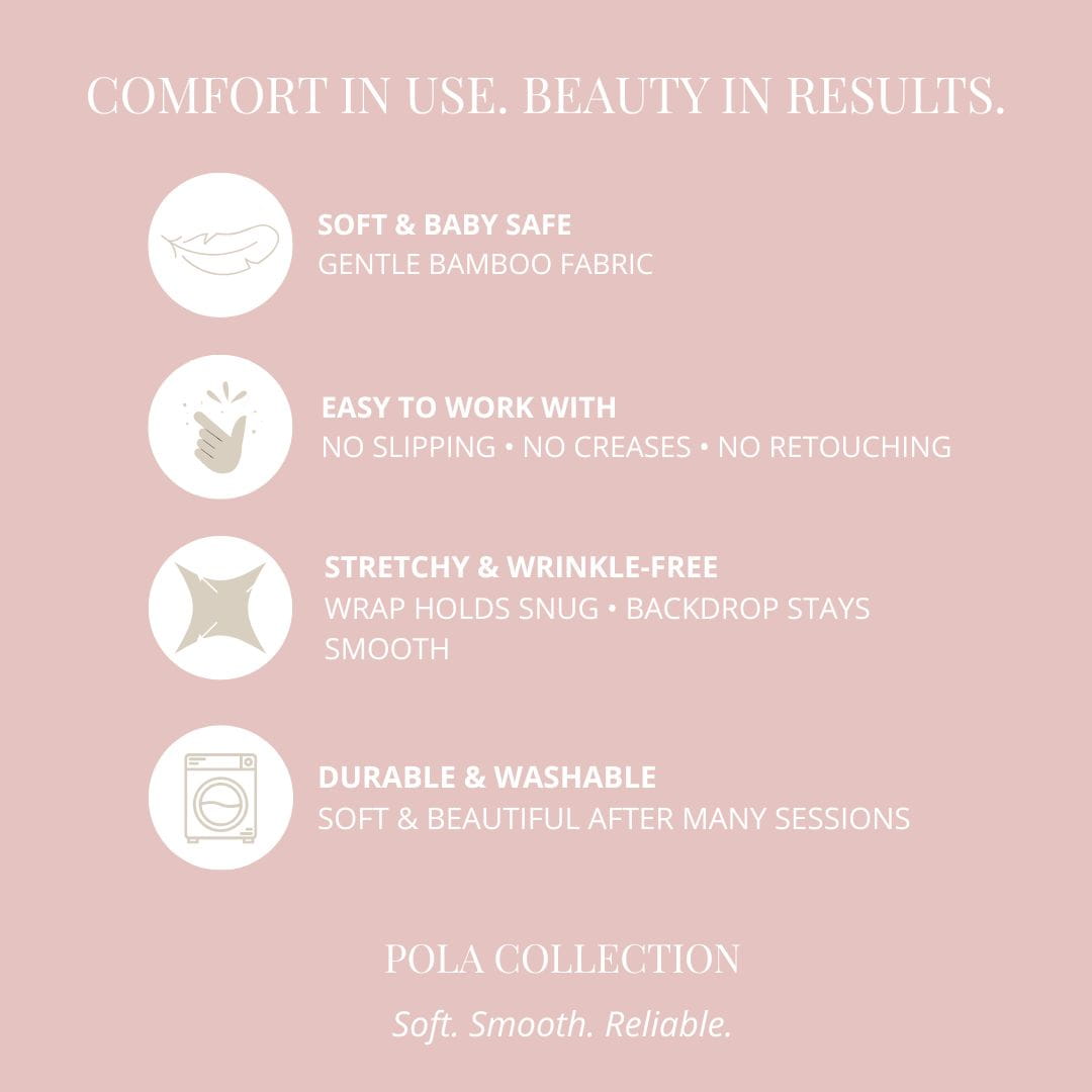 The fabric is breathable, baby-safe, and perfectly stretchy — draping smoothly over your beanbag or posing table and staying in place without slipping. The wrap matches perfectly, giving you a snug, comfortable swaddle that photographs beautifully without wrinkles or bunching.