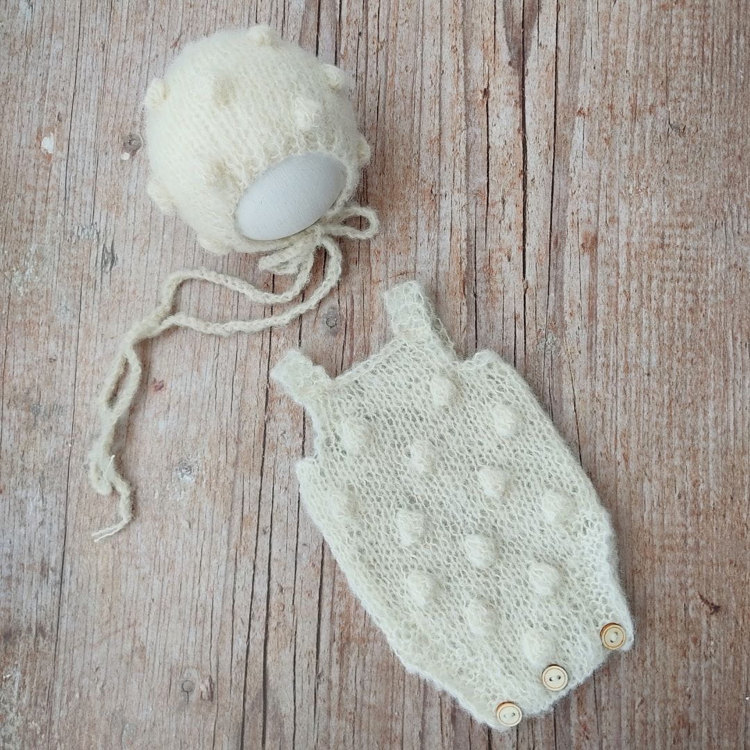 Unveil the ultimate cuteness with our hand-knitted romper with bobbles for newborn photography. This alpaca romper and bonnet set add charm and tenderness to your photos.